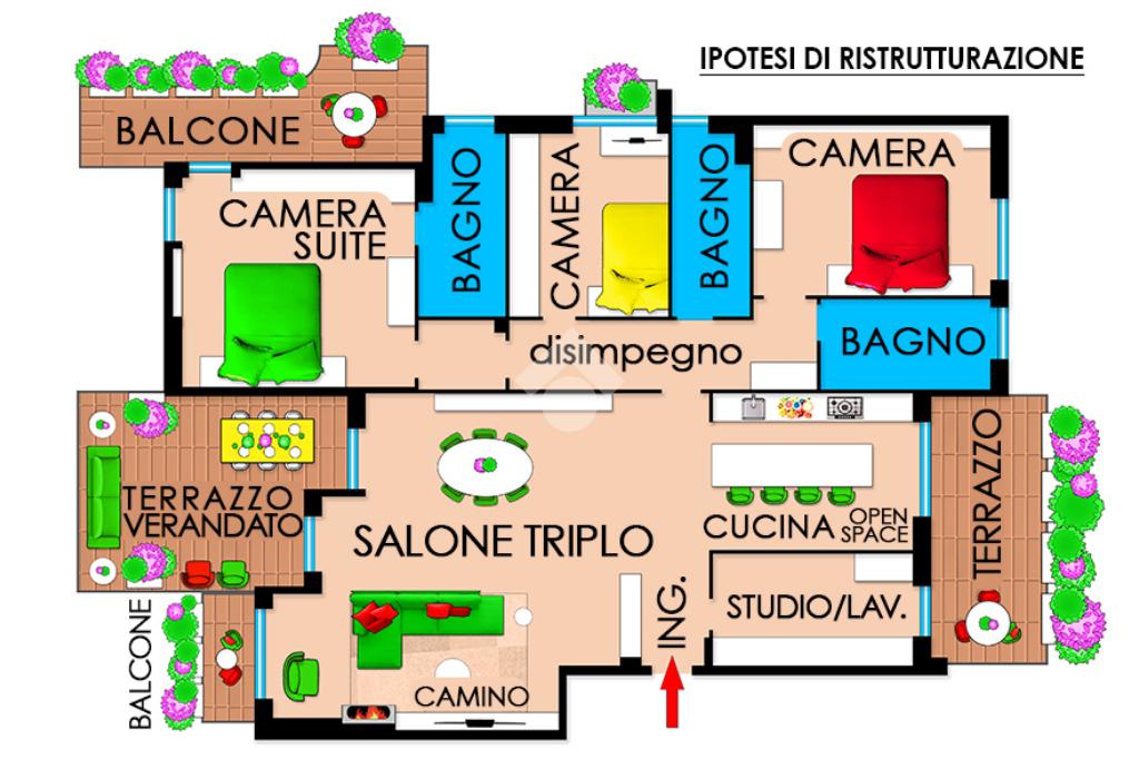 Via Lorenzo Rocci, in un signorile comprensorio, proponiamo appartamento così composto: doppio ingresso, salone doppio con camino, cucina abitabile, quattro camere, armadi a muro, tre bagni di cui uno ensuite, due terrazzi di cui uno verandato e due balconi.